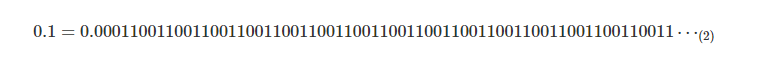 - 예를 들어 0.1이라는 숫자는 십진수로는 간단히 표현되지만 이진수로 나타내면 다음과 같이 0011(₂)이 무한히 반복되는 실수가 됨.