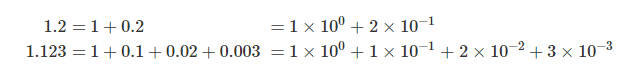 - 예) 십진수 부동소수점 방식에서 123.456이란 숫자는 123456 * 10^−3 이므로 123456이라는 정수 유효숫자와 −3이라는 정수 지수로 나타낼 수 있다. (정수 유효숫자: 123456, 정수 지수: -3)