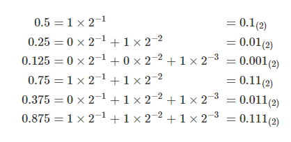- 1보다 작은 수의 경우에 십진법으로 간단히 표현되는 수도 이진법에서는 무한개의 유효숫자를 가질 수 있음