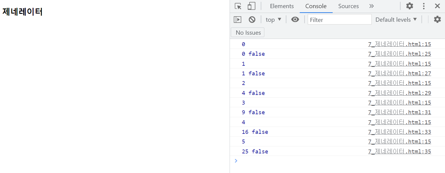 - 제네레이터 함수는 function* 키워드로 정의하며, yield 키워드를 사용하여 값을 반환
