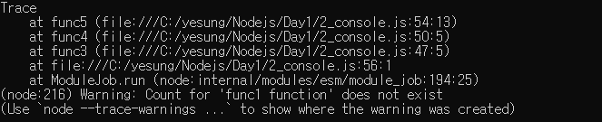 - console.trace([message][, ...args]): 현재 위치에서 스택 추적 정보를 출력