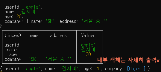 const user = {userid:'apple', name:'김사과', age:20, company:{name:'SK',address:'서울 중구'}}