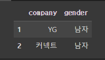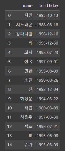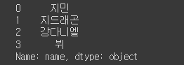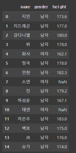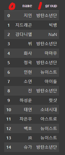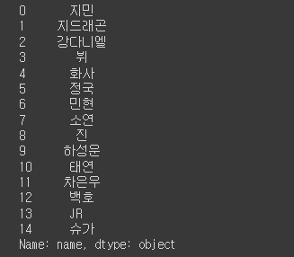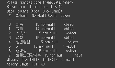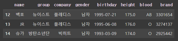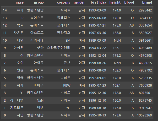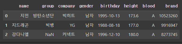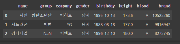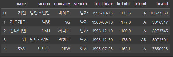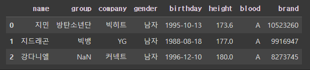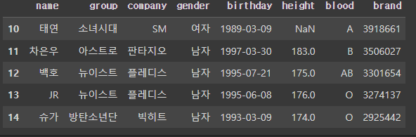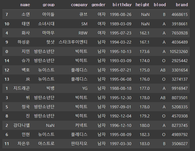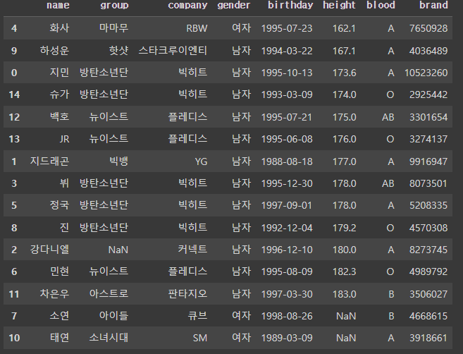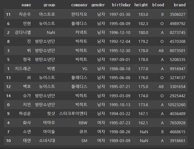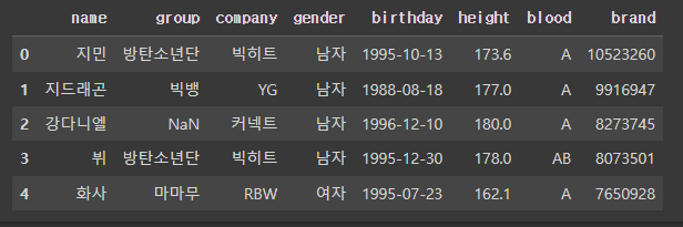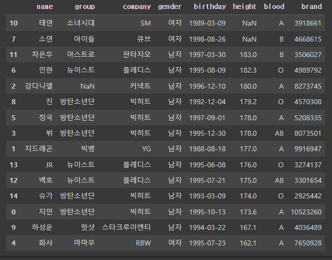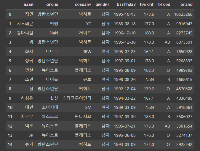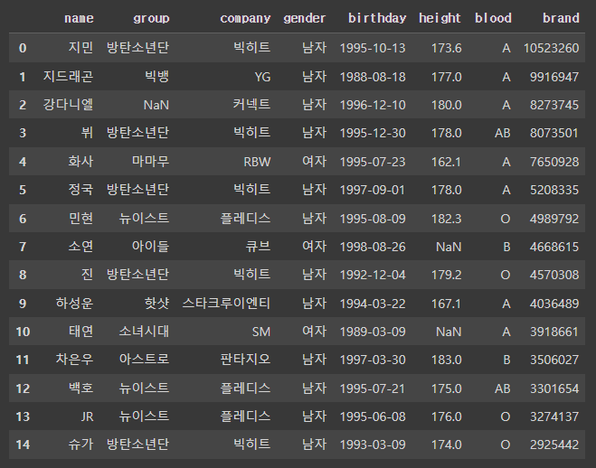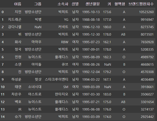 >>> Index(['이름', '그룹', '소속사', '성별', '생년월일', '키', '혈액형', '브랜드평판지수'], dtype='object')