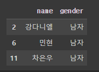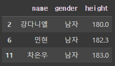 # df['height'] >= 180가 True인 사람들의 name과 gender열