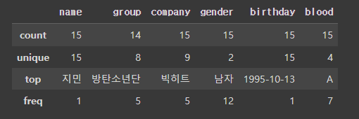 >>> Index(['name', 'group', 'company', 'gender', 'birthday', 'height', 'blood',