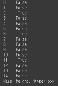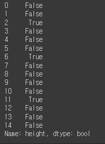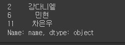 df['name'][df['height'] >= 180] # 키가 180 이상인 조건이 True인 사람들의 이름, df[df['height'] >= 180]['name']과 같음