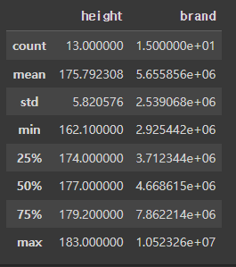 ✅ describe(): 통계 정보 출력, 수치데이터만 통계정보로 가져옴