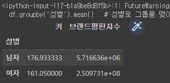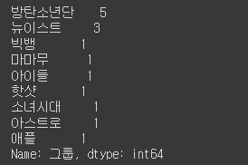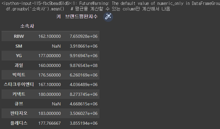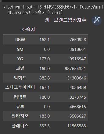 >>> <pandas.core.groupby.generic.DataFrameGroupBy object at 0x7f2aa56f8e20> # 소속사로 그룹화된 객체가 생성됨