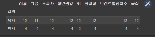 df.groupby('성별').count() # 성별로 그룹을 맺고 각 그룹에 대한 count(), NaN값 제외