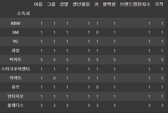 df.groupby('소속사').count() # 각 소속사가 index가 되어 coulumn별로 count됨