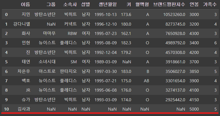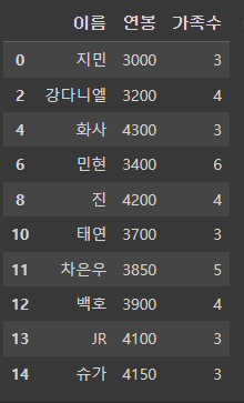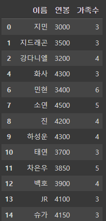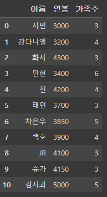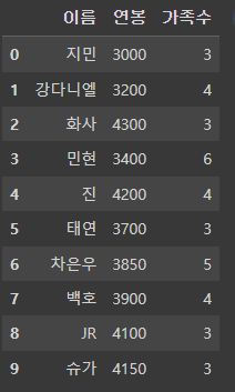 df_right = df_right.append({'이름':'김사과', '연봉':5000, '가족수':5},ignore_index=True)