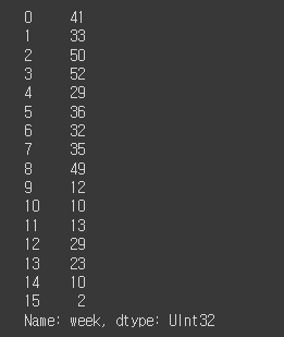 # isocalendar().week: 1년(52주 중)에 몇번째 주인지