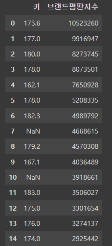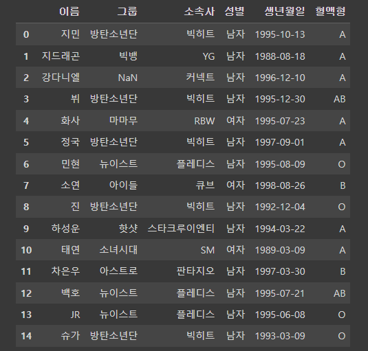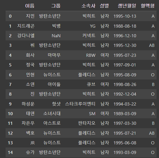 >>> Index(['이름', '그룹', '소속사', '성별', '생년월일', '혈액형'], dtype='object')