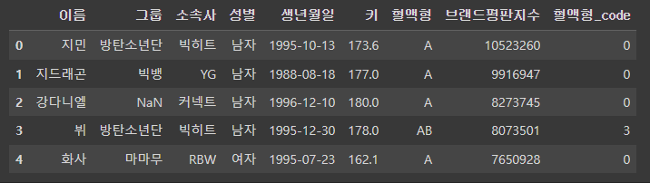 df['혈액형_code'] = df['혈액형'].map(blood_map) # blood_map 딕셔너리를 이용해 '혈액형'컬럼의 각 원소마다 적용