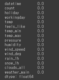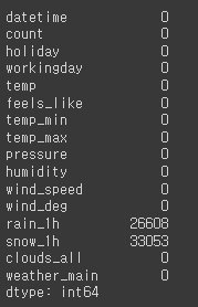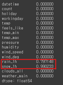 ✅ 결측지에 대한 비율이 높고 1시간당 비와 눈의 여부이기 때문에 오지않은 경우로 판단 ➡ 0으로 결측지 채움
