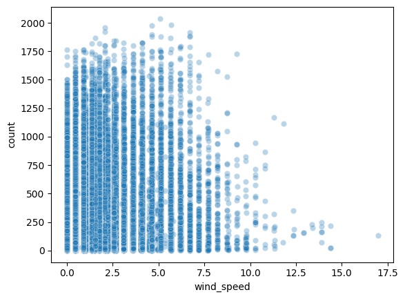 sns.scatterplot(x='wind_speed', y='count', data=bike_df, alpha=0.3)