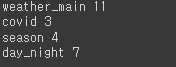 for i in ['weather_main', 'covid', 'season', 'day_night']: