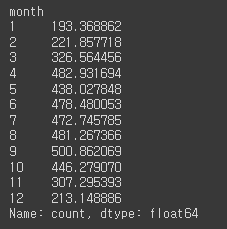 ✅ 해당 데이터의 상태를 비교해보기 위해 2019년도 데이터를 월별로 그룹하여 자전거 대여수 평균을 구하기