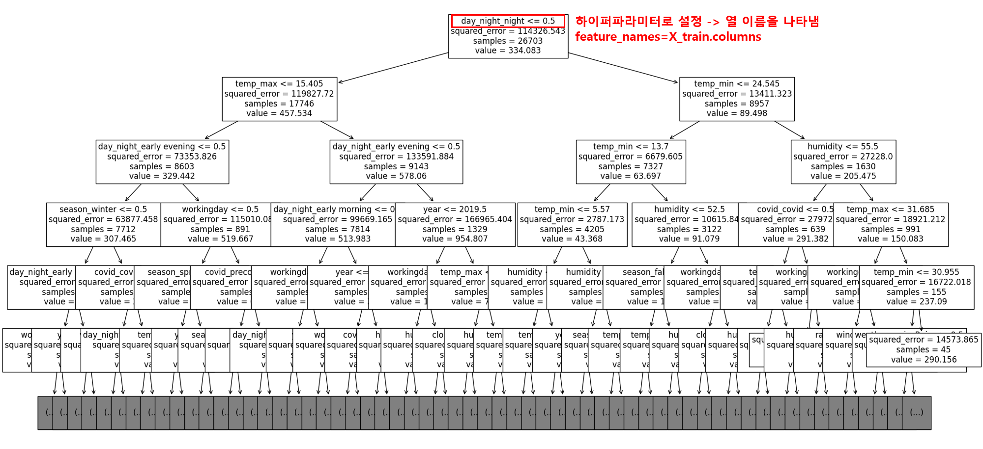 의사결정나무 파라미터 튜닝: 187.3015148952268 (성능이 정말 달라질 수 있음!!)