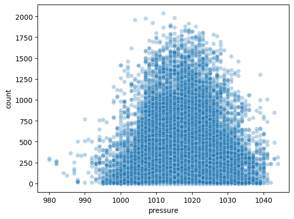 sns.scatterplot(x='pressure', y='count', data=bike_df, alpha=0.3)