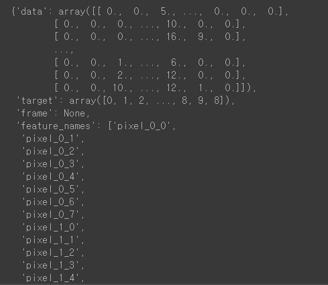 >>> dict_keys(['data', 'target', 'frame', 'feature_names', 'target_names', 'images', 'DESCR'])