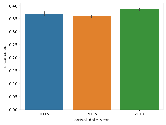 sns.barplot(x=hotel_df['arrival_date_year'], y=hotel_df['is_canceled'])