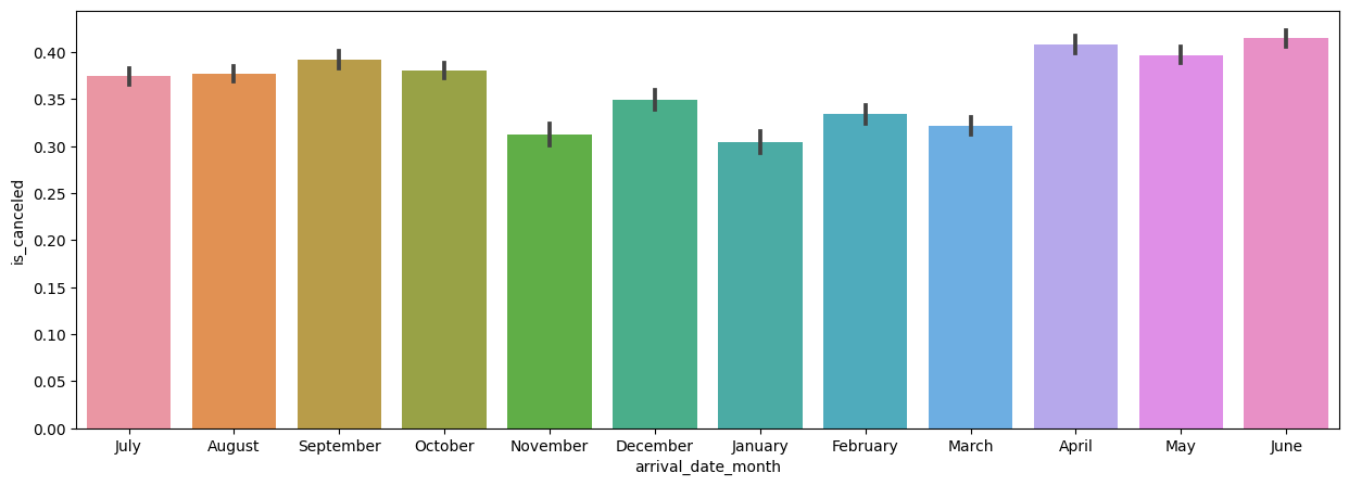 sns.barplot(x=hotel_df['arrival_date_month'], y=hotel_df['is_canceled'], order=months) # months(1~12월)의 순서대로 정렬