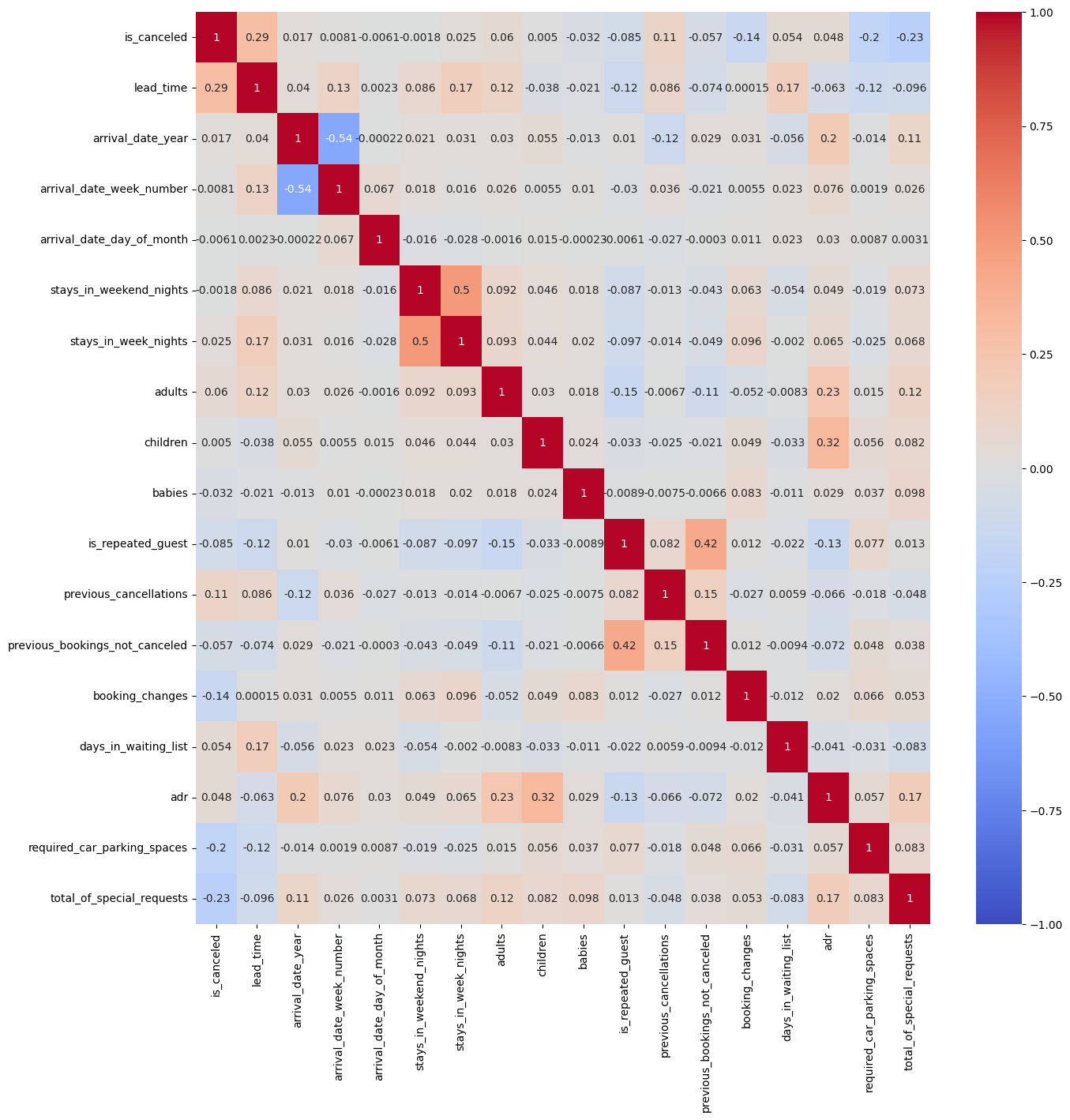 sns.heatmap(hotel_df.corr(), cmap='coolwarm', vmax=1, vmin =-1, annot=True)