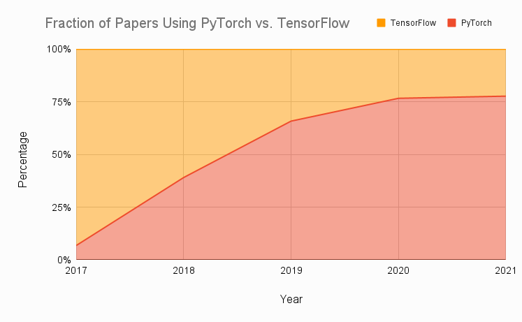 - 머신 러닝 논문, 코드, 데이터 세트 등으로 무료 오픈 리소스를 제공하는 것을 사명으로 하는 웹사이트인 Papers with Code의 데이터에서 3,319개의 리포지토리 중 70%에 가까운 3,319개의 리포지토리가 PyTorch로 구현된 반면, TensorFlow로 구현된 논문은 4%에 불과했습니다(작년의 11%에서 감소).
