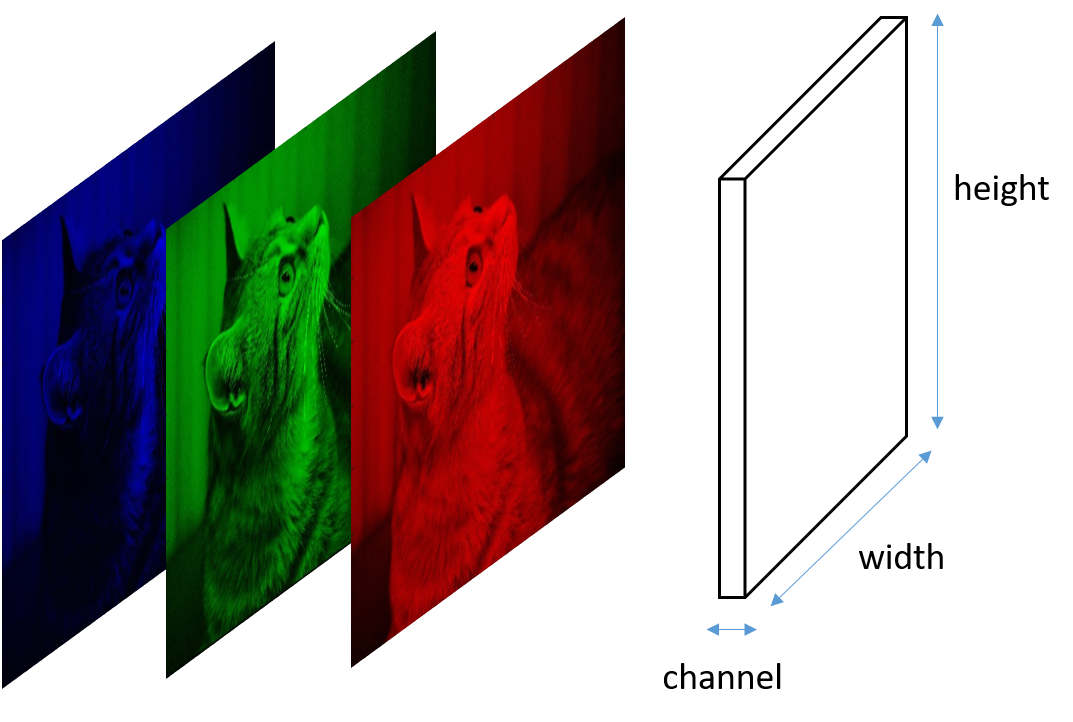 - 컬러 이미지는 3개의 채널(width, height, channel)로 이루어진 텐서(Tensor)