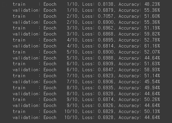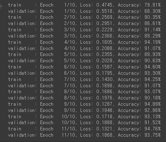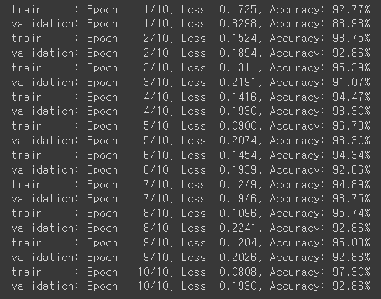 for phase in ['train', 'validation']: # train과 validation 따로 반복문을 돌아