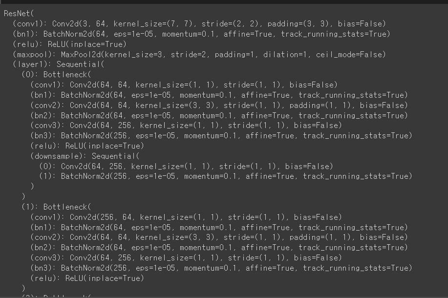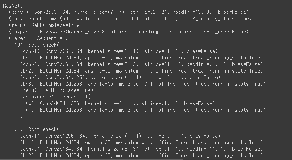 - 출력 부분의 레이어(fc 레이어)를 다시 설정하여 분류에 맞게 설정 (원래 Resnet50 모델은 분류를 1000개의 클래스로 하는데 우리는 에일리언/프레데터 두가지로 분류하여야 하기 때문에)
