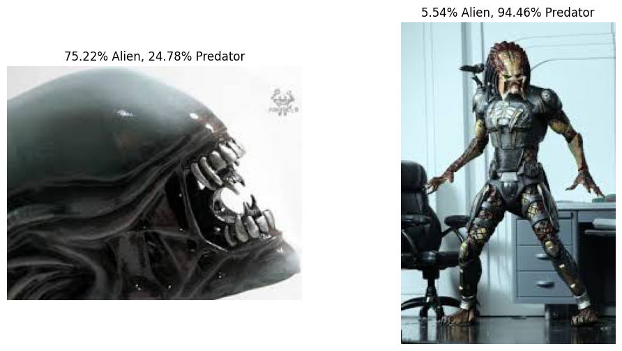 axes[1].set_title(f'{(1-y_pred[1,0]) * 100:.2f}% Alien, {y_pred[1,0] * 100:.2f}% Predator')