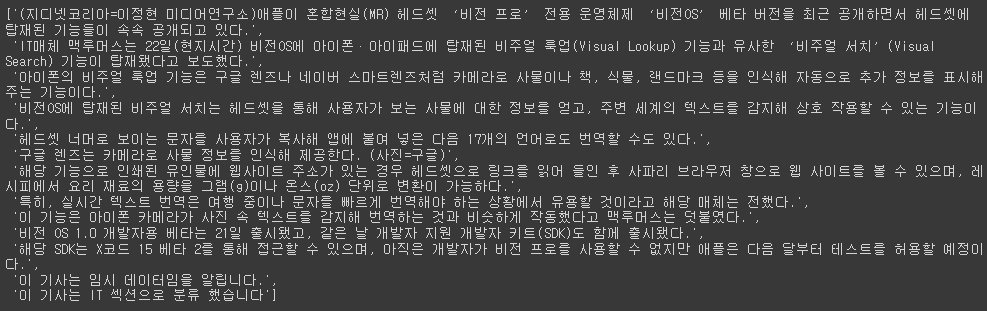 preprocessed_text.append(' '.join(text)) # 띄어쓰기를 적용하여 리스트에 추가