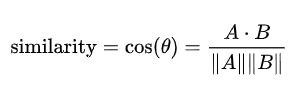 - 두 벡터의 방향이 완전히 동일한 경우에는 1의 값을 가지며, 90도의 각을 이루면 0, 180도로 반대의 방향을 가지면 -1의 값을 가짐