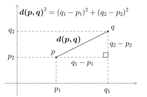 - 두 점 사이의 거리를 측정하는 유클리디안 거리를 사용하여 문서의 유사도를 구하는 방법으로 거리가 가까울수록 유사도가 높다고 판단
