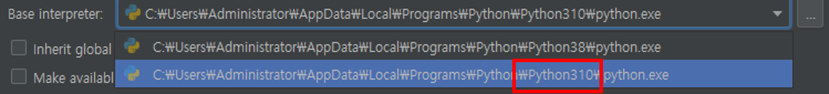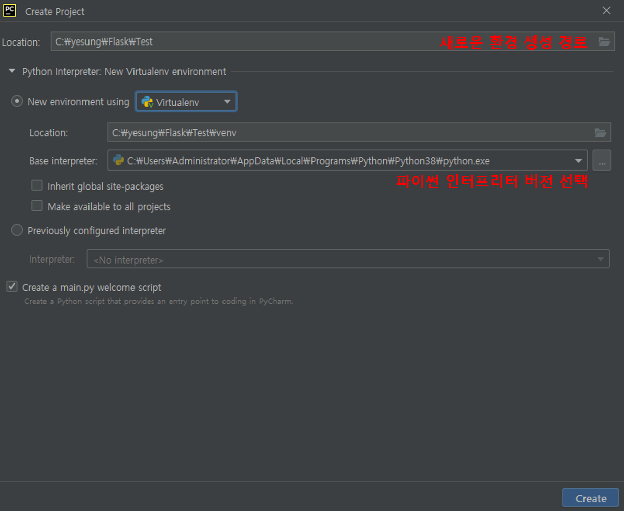 - 프로젝트 생성할 경로 설정 및 파이썬 인터프리터 버전 확인/선택