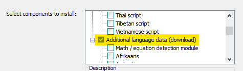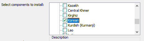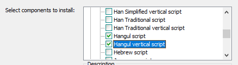- 설치중 Choose Components에서 Additional script data(download) 트리를 내려 Hangul script와 Hangul vertical script 를 체크, Additional language data(download)에서 korean을 체크