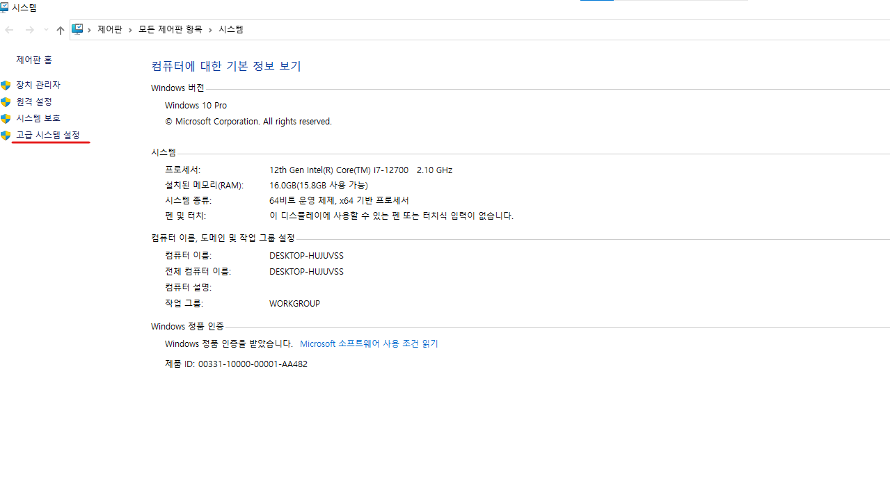 "고급 시스템 설정"을 클릭