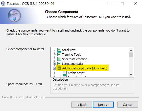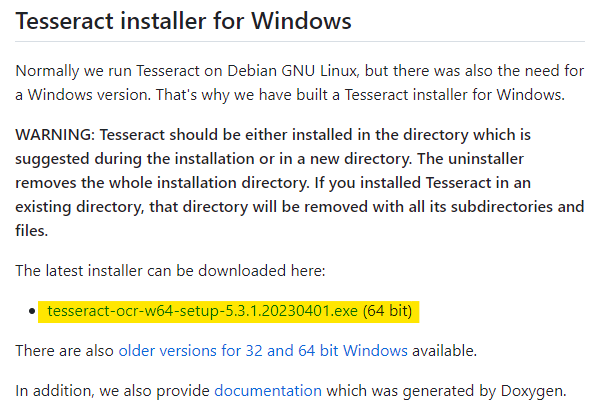 - 윈도우: https://github.com/UB-Mannheim/tesseract/wiki 에서 tesseract-ocr-w64-setup-5.3.1.20230401.exe 를 다운로드(2023-07-31 기준)