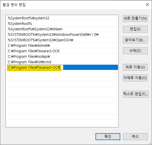 4. "새로 만들기" 버튼을 클릭 ➡ 테서렉트 설치 경로를 추가(C:\Program Files\Tesseract-OCR)