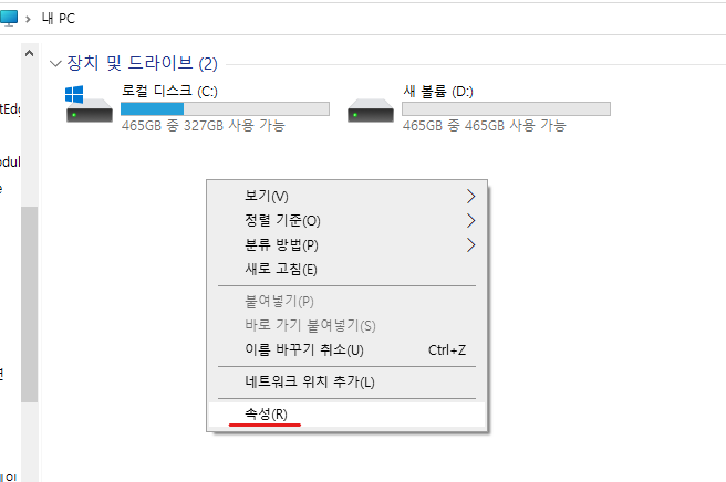 1. 탐색기(window 키 + e) ➡ "내 PC"에서 마우스 오른쪽 버튼 클릭 ➡ "속성"을 선택창을 최대화 한 후 좌측 메뉴