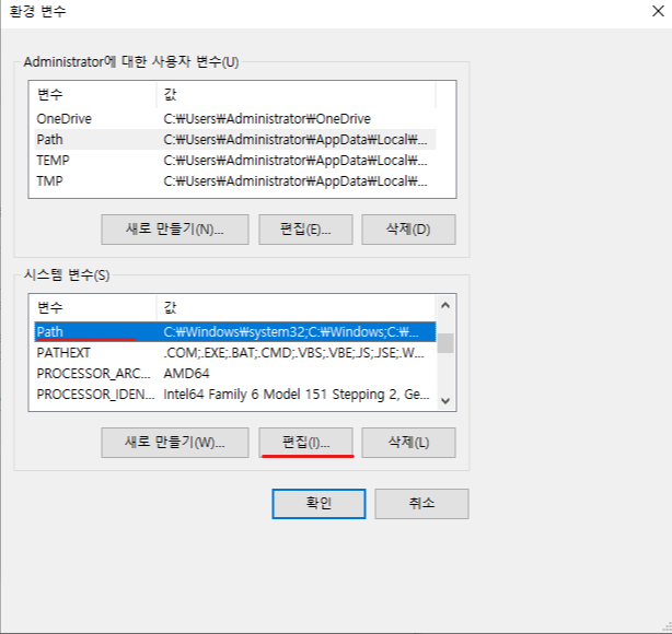 3. 시스템 변수에서 "Path"를 선택하고 "편집" 버튼을 클릭