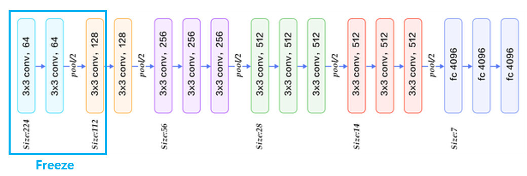 - conv layer3까지의 가중치값은 **고정(freeze)**시켜주고, 이후 layer(conv layer4~ fc layer3)까지의 가중치값이 학습될 수 있도록 **fine tuning(**논문에서는 fc layer만 fine tuning했을 때보다 conv layer까지 포함시켜 학습시켰을 때 더 좋은 성능을 보임)