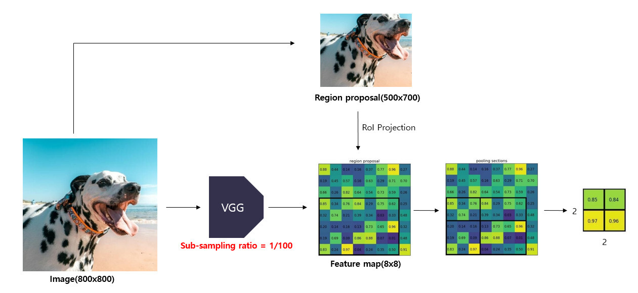 - Selective search를 통해 얻은 region proposals는 sub-sampling 과정을 거치지 않은 반면, 원본 이미지의 feature map은 sub-sampling 과정을 여러 번 거쳐 크기가 작아짐