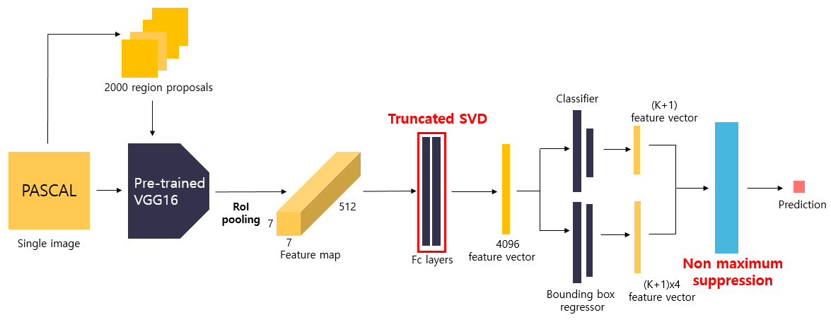 - detection 시간을 감소시키기 위해 **Truncated SVD(Singular Vector Decomposition)**을 통해 fc layer를 압축하는 방법을 제시