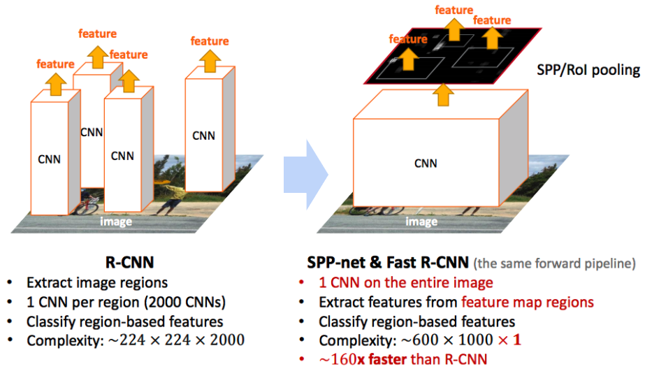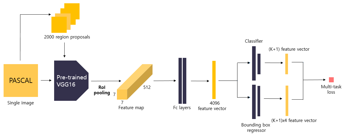 - Fast R-CNN은 단 1장의 이미지를 입력받으며, region proposals의 크기를 warp시킬 필요 없이 RoI(Region of Interest) pooling을 통해 고정된 크기의 feature vector를 fully connected layer(이하 fc layer)에 전달