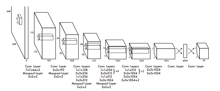 - DarkNet에 이미지를 입력하여 7x7x30 크기의 feature map을 얻어 loss function을 통해 학습