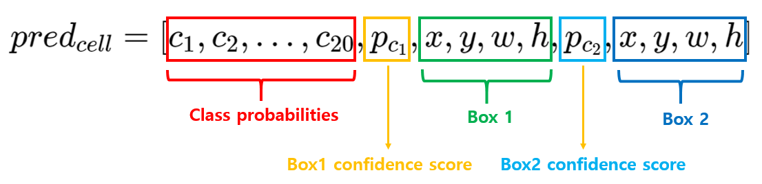 - 논문에서는 S=7, B=2, C=20 설정(PASCAL VOC 데이터셋을 사용하여 학습하였기에 class의 수가 20개) → 이미지별 예측값의 크기는 7x7x(2x5+20)