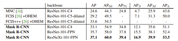 - instance segmentation task에서 가장 좋은 성능을 보인 FCIS+++와 OHEM을 결합한 모델보다 AP값이 2.5% 더 높게 나옴